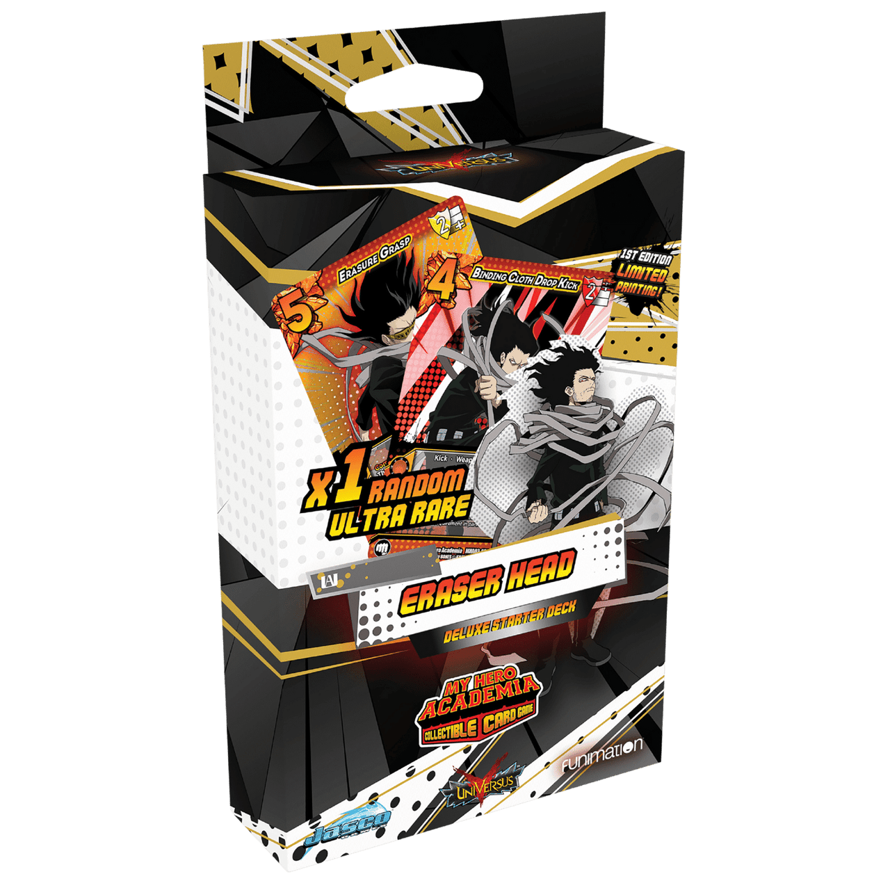 Pro Hero Eraser Head puts his students to task in this 52 card starter set for the MY HERO ACADEMIA COLLECTIBLE CARD GAME! Outmaneuver your foes, combo your moves, and master the binding cloth skill to attain victory with the Erasure Hero!